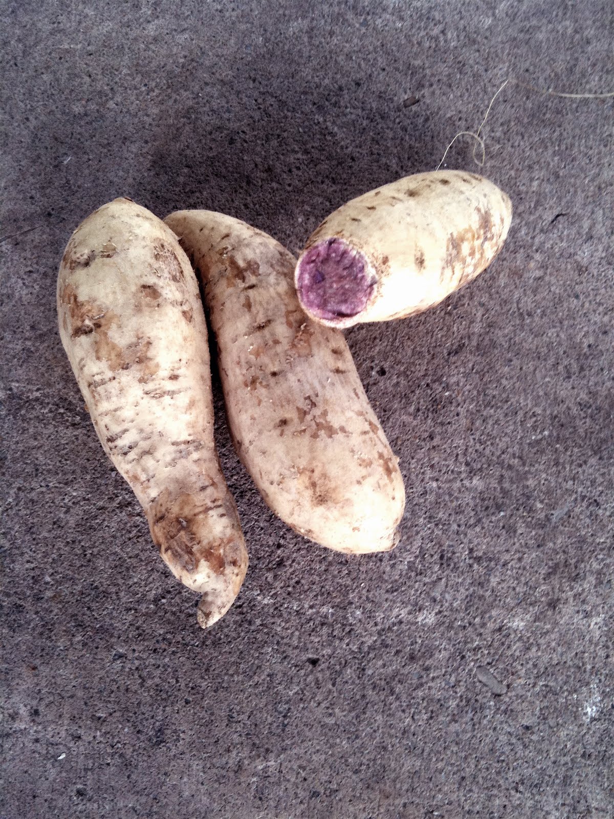 Having worked with the frozen version, I remained determined to find the real thing, so I was nearly speechless when I saw some of the white-skinned roots sitting in a box at my local farmer's market. My favorite organic purveyor was now carrying them! Holding them up excitedly I asked "Is this ube?" The proprietor of the stall looked at the tubers in my hand and said "That's purple yam. What's ube? I don't know ube." I said "Ube, it's um, it's a purple yam used in Filipino dishes." She shook her head knowingly. "So," she said as she weighed bok choy for another customer, "You have a Filipino wife?"